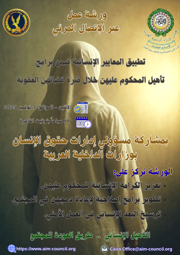 في إطار حرص الأمانة العامة لمجلس وزراء الداخلية العرب على تعزيز مبادئ حقوق الإنسان في العمل الأمني، تُعقد عبر الاتصال المرئي ورشة عمل بالتنسيق والتعاون مع وزاره الداخليه بجمهوريه مصر العربيه .. حول (تطبيق المعايير الإنسانية ضمن برامج تأهيل المحكوم عليهن خلال فترة قضائهن العقوبة). تهدف الورشة إلى تسليط الضوء على خصوصية المرأة داخل مؤسسات الإصلاح والتأهيل .. واستعراض التجارب المتميزة للدول العربية في هذا المجال .. ومناقشة سبل تطوير البرامج التأهيلية بما يتوافق مع المعايير الإنسانية الحديثة.